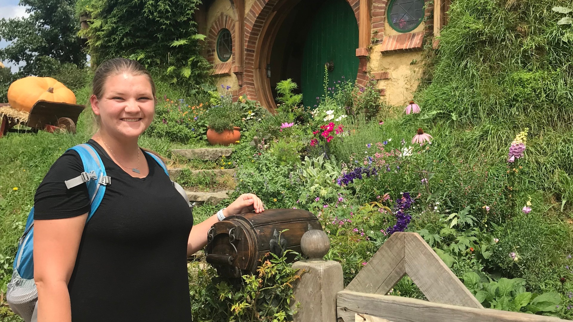 When I found out that Kris and Josh wanted to go to New Zealand, I knew that one of the things I wanted to do if I could was go visit Hobbiton. I had the chance to visit over the weekend, and loved every minute of it. While it is possible to get a ticket and visit without going through an organization, I decided it was easier to book through a tour group so that transportation would be included. On this particular tour, there was a large group of individual travelers of my general age from many different countries. We had a wonderful time together, which made the tour even better. The drive from Auckland to the small farming town of Matamata, where the Hobbiton film set is located, took two hours. We passed through a significant amount of beautiful farmland. I was absolutely cracking up at our tour guide’s information along the drive. My favorite fact from the drive – “See those round things in the field? Those are hay bales.” Upon arrival, we waited for a little bit before our tour began. This worked out wonderfully for me, because it gave me a chance to get a coffee in the cafe and check out the postcards in the gift shop. Our tour was led by a woman named Leonie from Germany who was doing a work away year at Hobbiton. We had an incredible time wondering along the path through the set, learning random facts, and admiring the incredible details. After our tour, we stopped in the Green Dragon to get a beer before having lunch and continuing on with our day.